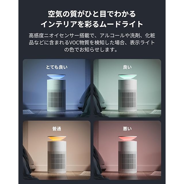 【4色の空気質表示ライトを含む10色のムードライト】4色の空気質表示ライトで空気質が一目で分かります。また、全10色のライトは、自分の好みに合わせて明るさや色合いを調節可能。オシャレな間接照明やムードライトとしてお使いいただけます。さらに、光センサーも搭載されており、夜間は自動で消灯し静かに運転を行います。