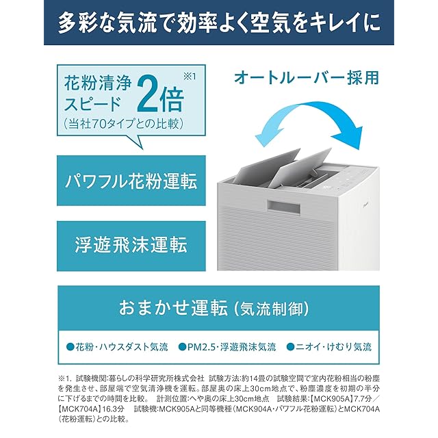 加湿機能付き大風量空気清浄機。広いリビング対応。省スペースで設置(設置面積はA3用紙以下)