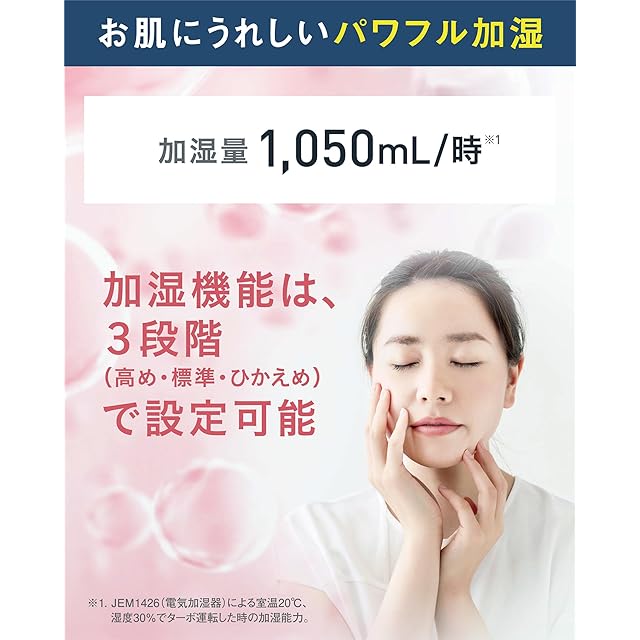 たっぷりの加湿量 1,050ml/時。加湿する水も本体内部もトリプル対策で清潔に保つ。(ツインストリーマ、抗菌加湿フィルター、水トレーに銀イオン剤)