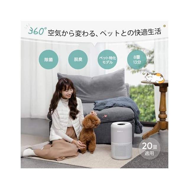 【20畳まで対応、360°効率よく吸気】①円筒型なので360°全方位の吸気が出来ます。②また先進的なターボチャージャー技術により、吸引力が一段とアップされます。③浄化スピードが優れており、8畳のお部屋なら約13分で空気浄化でき、ペット多頭飼いの20畳のリビングでも大活躍してくれます。