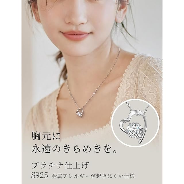 永遠の愛と絆を象徴するハートモチーフネックレス。胸元で可憐に輝くデザインは、女性らしさを引き立てながら、日常の装いに華やかさを添えます。素材は耐久性に優れたシルバー925を採用し、表面には**プラチナ仕上げ(ロジウムコーティング)**を施すことで、変色やくすみに強く、美しい光沢を長く保ちます。 きらめく スワロフスキージルコニア はまるでダイヤモンドのような輝きを放ち、シンプルながらもエレガントな存在感を演出。さらにニッケルフリー加工で敏感肌の方も安心してお使いいただけます。しなやかで切れにくい45cmのベネチアンチェーンを採用。デコルテを美しく見せ、快適な着け心地を実現します。 誕生日や記念日、クリスマス、ホワイトデー、母の日など、大切な人へのプレゼントにも最適。専用ジュエリーボックスとギフトバッグを付属し、贈り物としてそのままお渡しいただけます。自分へのご褒美にもおすすめの、上品で愛らしいネックレスです。