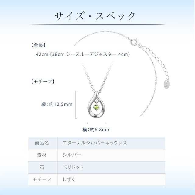 変色しにくいオリジナル素材「エターナルシルバー」を使用し、流れるようなしずくのモチーフがみずみずしく輝くネックレス。中央のペリドットが軽やかに揺れるたび、華やかな印象を与えます。※天然石を使用しているため、実際の色味や風合いが異なる場合がございます。