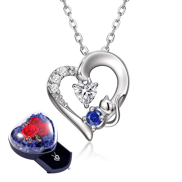 《新品未開封》[sassu fine] 誕生石ネックレス ネコ オープンハート 国際標準シルバー925 レディースネックレス ローズ 枯れない花プリザーブドフラワー(9月)