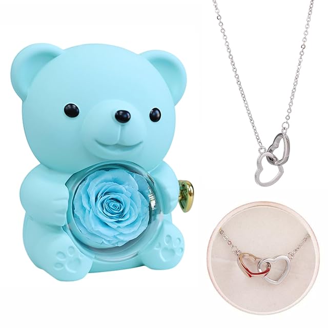 《新品未開封》[Drawelry] 本物のローズベアジュエリーボックス付きパーソナライズハートネックレス、プリザーブドエターナルローズハグベアギフトセット、ハートネックレスベアボックスクリスマスバレンタイン誕生日プレゼント女性用 (Sky blue)