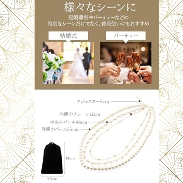 このパールネックレスは、冠婚葬祭や結婚式、パーティーなどの特別なシーンだけでなく、普段使いにもおすすめです!パールの大きさや大ぶりなデザインは、どんなコーディネートにも華やかさをプラスしてくれます。また、ウェディングやお呼ばれのシーンでも、上品さを引き立てるアクセントとして活躍します。