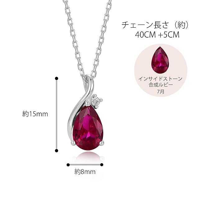 商品仕様:素材:シルバー925,主石:7月の誕生石 ルビー。 ペンダントトップ:(約)横8mm×縦15mm ,ルビー:9mm。チェーン長さ:(約)40~45cm(5cmアジャスター付)付属品:精美な包装ケース、高級ベロア調ポーチ 、専用磨きクロス