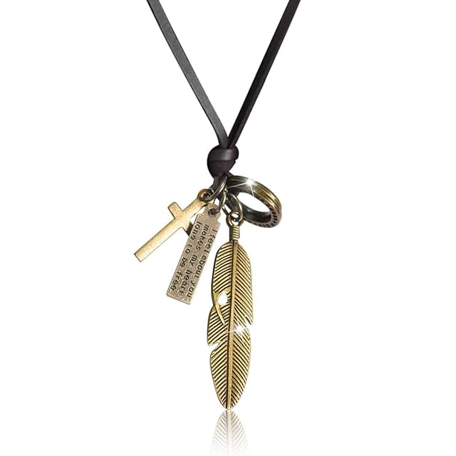 《新品未開封》[Richapex] レザー ネックレス フェザー アンティークゴールド クロス 十字架 本革 革紐 アクセサリー プレート 刻印 メンズ レディース ウイング wing 翼 羽根 父の日