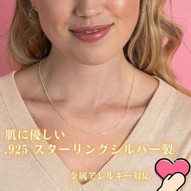 耐変色性スターリングシルバーネックレス ボックスチェーン - このスターリングシルバーネックレスは純925スターリングシルバーに 18K ゴールドがメッキされていることにより、変色防止効果があり、長期にわたり輝きを保ちます; あなたの大事なシルバーネックレスの変色を最小限に抑えるために、ヘアースプレー、パフューム、デオドラント、塩素や洗剤等の化学物質からは出来るだけ遠ざけてください. 細いチェーンのスターリングシルバーネックレスをジュエリーボックスにしまう前に、コットンやマイクロファイバー布で軽く拭いてからしまって下さい