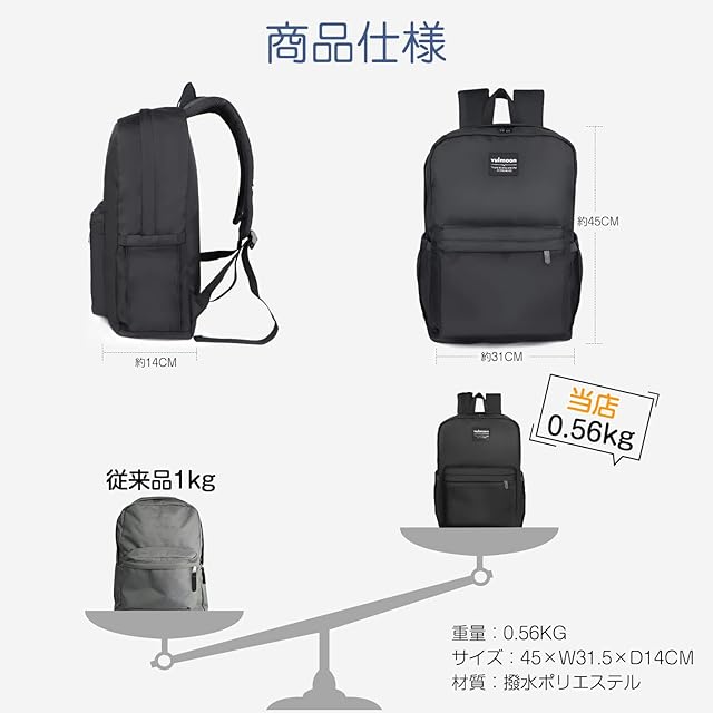 【優れた防水性と耐久性の素材】サイズ:45×31.5×14cm 大容量で必要なものがしっかり入りますが、わずか0.56kgと軽いのがポイント。防水性・耐摩擦性・通気性の優れた高密度,柔らかなポリエステル生地を使用し、雨の日に出勤しても安心です。幅広で7cmリュックストラップには弾力性がある蒸れにくいクッションメッシュ素材を採用しており、長時間背負ったまま通勤通学や移動でも快適に過ごせます。