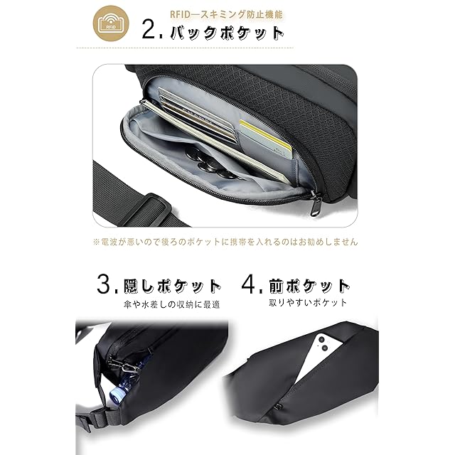 【防犯デザイン&セキュリティポーチ】貴重品を守るためにデザインされたショルダーバッグ:近年国内外で多発しているスキミング(外部から特殊機器を使用しクレジットカード情報を盗み取る犯罪)を完全に防止するメインポケットを搭載。ボディバッグの中でも多くの荷物をすっきりまとめて持ち運べる基本的なスペックに加えて、貴重品入れとしても使える背面側の防犯用隠しポケットがある点も嬉しいポイントです。