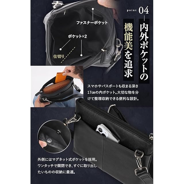 【カラーバリエーション】ブラック/ネイビー/ダークグリーン/アッシュグレー <BR><BR> 【最高品質のトップグレインレザーを採用】表層面の不揃いな部分をカットし、均一で美しい外観が特徴です。耐久性にも優れ、長期間の使用にも向いている最高品質のレザーで高級感のあるアイテムに広く使用されています。バッグ本体だけでなく、ショルダーにも本革(トップグレインレザー)を使用しています。 <BR><BR> 【スッキリ見えるスマートなシルエット】底マチを3.5cmに設定。収納力も確保しながらふくらみを抑える薄型設計。財布やスマホ、その他の小物をいれすぎで膨らんでしまってもそのまま膨らんでしまっては見栄えが悪いですが、薄型設計でスマートに使用できます。 <BR><BR> 【iPadも入る抜群の収納力】iPadは11インチまで収納できます。iPadを入れても財布、スマホ、名刺入れやカードケースも収納できる収納力があります。 <BR><BR> 【内外ポケットの機能美を追求】内側にはメインポケットの両側にファスナー付きポケット、仕切りを入れた2つの小ポケットがあります。小ポケットは深さ約17cmでスマホやパスポートも収めることができる深さです。アイテムを分けて整理収納できる便利な設計になっています。外側にはマグネット式ポケットを採用。ワンタッチで開閉できるのですぐに取り出したいものの収納に最適です。 <BR><BR> 【自由なスタイルを楽しめる3WAY仕様】ショルダーベルトは取り外しができるので、クラッチバッグ、バッグインバッグとして、ショルダーベルトを使えばショルダーバッグとして利用できる3WAY仕様です。 <BR><BR> 【自在に長さ調整可能なショルダーベルト】70cm~130cmの間で自在に長さ調整ができます。また、ショルダーベルトの幅は約2.5cmなので肩に食い込まない絶妙なスマート幅になっています。