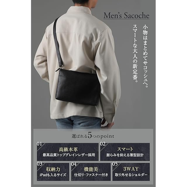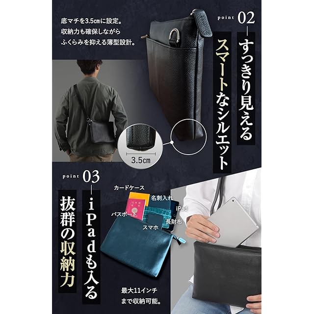 【カラーバリエーション】ブラック/ネイビー/ダークグリーン/アッシュグレー <BR><BR> 【最高品質のトップグレインレザーを採用】表層面の不揃いな部分をカットし、均一で美しい外観が特徴です。耐久性にも優れ、長期間の使用にも向いている最高品質のレザーで高級感のあるアイテムに広く使用されています。バッグ本体だけでなく、ショルダーにも本革(トップグレインレザー)を使用しています。 <BR><BR> 【スッキリ見えるスマートなシルエット】底マチを3.5cmに設定。収納力も確保しながらふくらみを抑える薄型設計。財布やスマホ、その他の小物をいれすぎで膨らんでしまってもそのまま膨らんでしまっては見栄えが悪いですが、薄型設計でスマートに使用できます。 <BR><BR> 【iPadも入る抜群の収納力】iPadは11インチまで収納できます。iPadを入れても財布、スマホ、名刺入れやカードケースも収納できる収納力があります。 <BR><BR> 【内外ポケットの機能美を追求】内側にはメインポケットの両側にファスナー付きポケット、仕切りを入れた2つの小ポケットがあります。小ポケットは深さ約17cmでスマホやパスポートも収めることができる深さです。アイテムを分けて整理収納できる便利な設計になっています。外側にはマグネット式ポケットを採用。ワンタッチで開閉できるのですぐに取り出したいものの収納に最適です。 <BR><BR> 【自由なスタイルを楽しめる3WAY仕様】ショルダーベルトは取り外しができるので、クラッチバッグ、バッグインバッグとして、ショルダーベルトを使えばショルダーバッグとして利用できる3WAY仕様です。 <BR><BR> 【自在に長さ調整可能なショルダーベルト】70cm~130cmの間で自在に長さ調整ができます。また、ショルダーベルトの幅は約2.5cmなので肩に食い込まない絶妙なスマート幅になっています。
