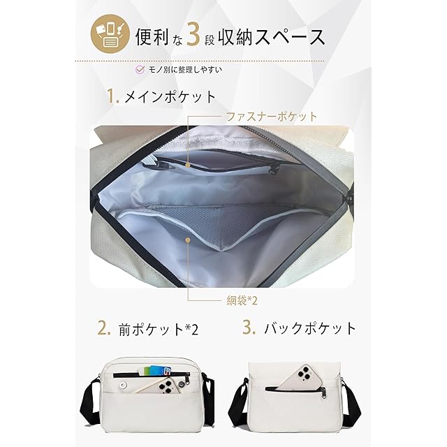 【多機能収納】サイズ(長さ*幅*高さ):28*8*20cm。500mlペットボトル、10.5インチipad、折り畳み傘が入る横長サイズ。ちょっとしたお出かけに、最低限のモノをコンパクトに持ち運べる容量に。整理整頓がしやすい3層8ポケット収納。鍵の取付に便利なキーストラップを装備。さらに、防犯用の隠し背面ポケット付き。毎日持ち歩くショルダーバッグとして優秀です!
