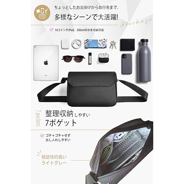 【多機能収納】サイズ(長さ*幅*高さ):28*8*20cm。500mlペットボトル、10.5インチipad、折り畳み傘が入る横長サイズ。ちょっとしたお出かけに、最低限のモノをコンパクトに持ち運べる容量に。整理整頓がしやすい3層8ポケット収納。鍵の取付に便利なキーストラップを装備。さらに、防犯用の隠し背面ポケット付き。毎日持ち歩くショルダーバッグとして優秀です!
