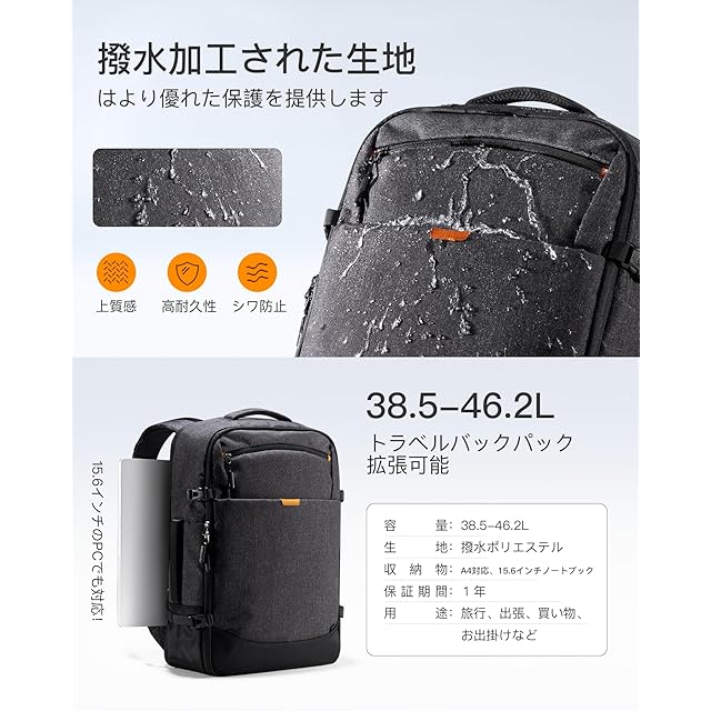 商品名:《新品未開封》Inateck 38.5-46.2Lトラベルバックパック 拡張可能 機内持ち込み手荷物 ハンドラゲッジ トロリーストラップ付き 最大17.3インチラップトップ収納可能 盗難防止 撥水加工 耐衝撃 通勤 出張 通学 男女兼用