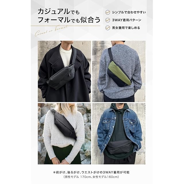 【機能的でもオジサンくさいのはイヤだ..】というお客様の声に応えたボディバッグ:意外とボディバッグに関しては、「おじさんくさい」「一昔前のデザイン」と思われるボディバッグが多かったりと、選び方が少し難しい部分もあるボディバッグ。時代や流行に左右されず、洗練されて、誰でも着けるだけで高見えするデザインを追い求めました。ユニセックスデザインのため、男性用 女性用 どちらも似合うデザイン。キッズや学生から 20代 30代 40代 50代ギフトやプレゼント用にも。また普段使いから海外旅行、ジム、ウォーキング、お散歩など幅広いシーンでも使えます。