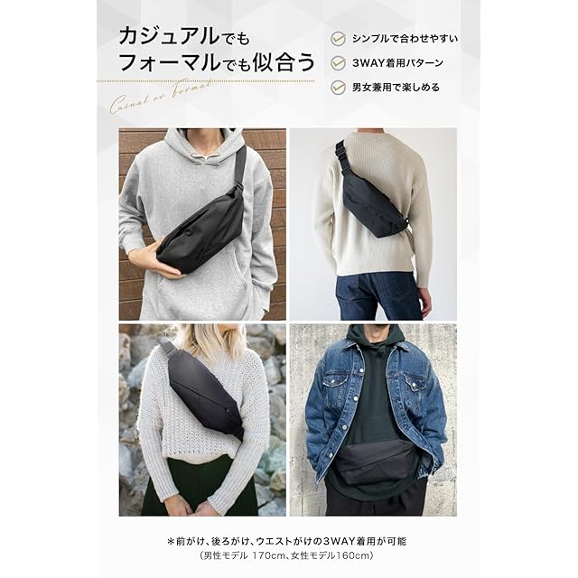 【機能的でもオジサンくさいのはイヤだ..】というお客様の声に応えたボディバッグ:意外とボディバッグに関しては、「おじさんくさい」「一昔前のデザイン」と思われるボディバッグが多かったりと、選び方が少し難しい部分もあるボディバッグ。時代や流行に左右されず、洗練されて、誰でも着けるだけで高見えするデザインを追い求めました。ユニセックスデザインのため、男性用 女性用 どちらも似合うデザイン。キッズや学生から 20代 30代 40代 50代ギフトやプレゼント用にも。また普段使いから海外旅行、ジム、ウォーキング、お散歩など幅広いシーンでも使えます。