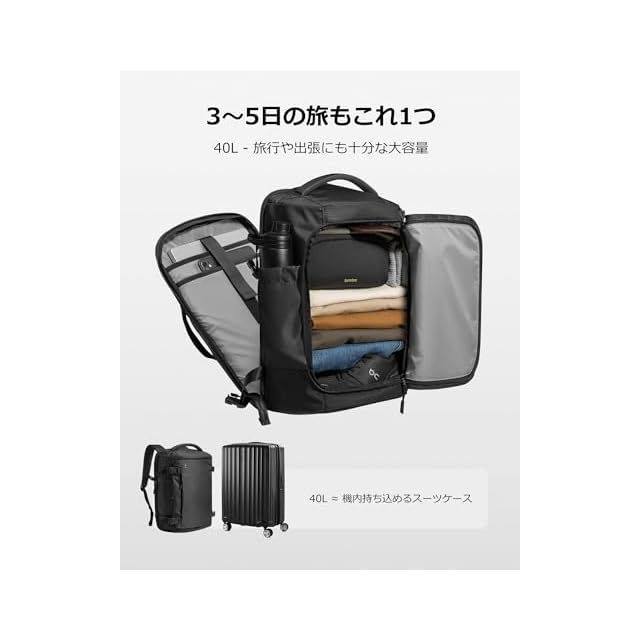 【40L大容量で数日間の旅もこれ1つ】旅行用バックパックとして設計された40Lモデルは、着替えやガジェット、洗面用品などを一括収納、長旅に必要なすべてを収め、2泊3日~4泊5日間の旅行に最適です。サイドにベルトの搭載により中身が少ない時もコンパクトに圧縮され、持ち運びが軽く、機敏な移動を実現します。機内持ち込み可能な外寸:52cm x 33cm x 23cm、重量:1070g。<BR/>【機内持ち込み・保安検査に便利】PC収納部は180°までフルオープン可能で、主室を開けずに、デバイスを取り出さずに、保安検査をスムーズに通過できます。大部分航空会社の機内持ち込み手荷物規格に適合*、空の旅に最適。天面&側面ハンドル付きで、満席便の頭上収納棚・飛行機座席・保安検査カゴからでも一瞬でサッと取り出せ、移動中のストレスを最小化します。*航空会社により手荷物規格が異なるので、事前にご利用の航空会社の機内持ち込み手荷物規格をご確認ください。<BR/>【スマート収納システム】仕分け機能にこだわった収納設計!クラムシェルタイプのメイン室はスーツケースのように広く開けて荷物を整理しやすい。専用PC収納ポケットに17.3インチノートPCや13インチiPadを分けて収納可能。大きなクイックアクセスフロントポケット、サングラスや小物用のトップポケット、そしてボトルや傘用のサイドポケットなど、旅行・出張を快適にする収納機能が満載し、パスポートやチケット、スマホなどすぐに必要なものがサッと取り出せ、探し物ゼロの快適さが魅力。<BR/>【軽量・スリム・高耐久】高品質の軽量ポリエステル生地を採用し、軽さと強さを両立。日常の移動や旅行にも耐えるタフな設計です。プレミアムYKKファスナー、堅牢な構造やしっかりとした縫製で、毎日の使用にも長く応え、長持ちや軽やかな持ち運びを実現します。<BR/>【快適な背負い心地】3D構造の背面パネル、厚みのあるフィット感抜群のショルダーパッド、調整可能なチェストストラップにより、人間工学に基づいたサポートを実現し、長時間の移動でも負担を軽減。背面にはスーツケースのハンドルに通せるラゲッジストラップ付きで、移動の多い出張や旅行にも最適です。