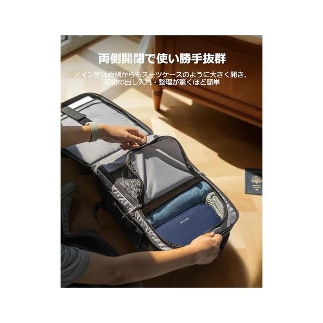 【スマート収納システム】仕分け機能にこだわった収納設計!クラムシェルタイプのメイン室はスーツケースのように広く開けて荷物を整理しやすい。専用PC収納ポケットに17.3インチノートPCや13インチiPadを分けて収納可能。大きなクイックアクセスフロントポケット、サングラスや小物用のトップポケット、そしてボトルや傘用のサイドポケットなど、旅行・出張を快適にする収納機能が満載し、パスポートやチケット、スマホなどすぐに必要なものがサッと取り出せ、探し物ゼロの快適さが魅力。