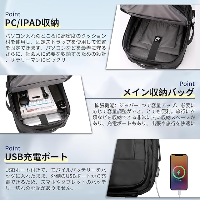 商品名:《新品未開封》[SOTCAR] 【2025新登場!拡張可能!】リュック ビジネスリュック 拡張 メンズ 3way リュックサック 防水 15.6インチ 大容量 収納多ポケット USB充電 人気 おしゃれ(ブラック)