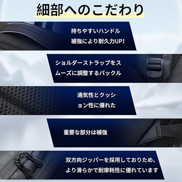 【便利な3 WAY】ショルダーベルトの太さが適切で、クッション性のある通気メッシュ素材を採用し、両肩の負担を軽減し、気楽に体に背負うことができます。ショルダーベルトの長さは調節でき、身長や性別の異なるお客様に適しています。また、三角形の二重縫いの技術を採用し、より良い耐荷重能力を備えており、断裂することの心配はありません。3WAY仕様(リュック、横手提げ、縦手提げタイプ)、お客様やビジネスパートナーの前でリュックを取り外すと安心できます。さらに重要なのは、出張旅行用のスーツケースに掛けることができる専用キャリーオン帯も付いています。