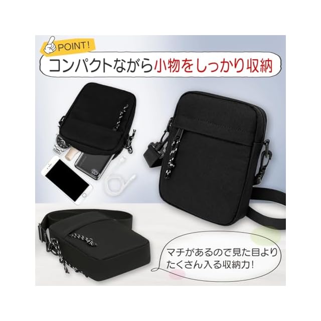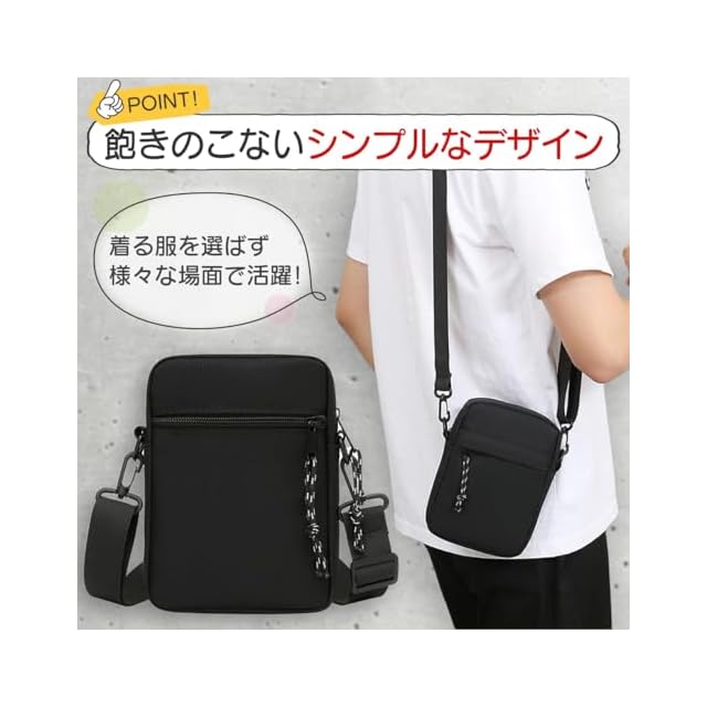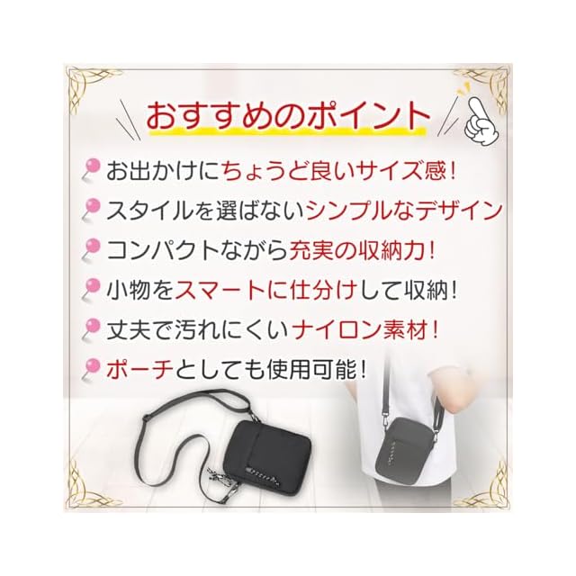 ・ちょっとしたお出かけに必要な小物や貴重品を収納するのにちょうど良いサイズ感!<br> ・飽きのこないシンプルなデザイン!着る服やシーンを選ばず、様々な場面で活躍してくれます。<br> ・コンパクトながらマチがあるので、見た目よりも小物がたくさん入る収納力!<br> ・斜めがけして前に持ってきても邪魔にならず、超軽量なのでお出かけの負担になりません。<br>・ 使い勝手のいいファスナー付きのポケットが3つあり、必要な小物をスマートに仕分けして収納できます。<br>・ 重さはたった約135g!耐水性・防水性に優れた丈夫で汚れにくいナイロン素材!<br> ・バッグのクチはファスナーでしっかり閉まるので、中の小物が落ちにくく物も取り出しやすい!<br>・ 斜めがけできるストラップは取り外すこともできるから、ポーチとしても使用可能です。<br> ・汚れてもすぐに洗えて気軽に使えるタイプだからアウトドアに最適!<br>