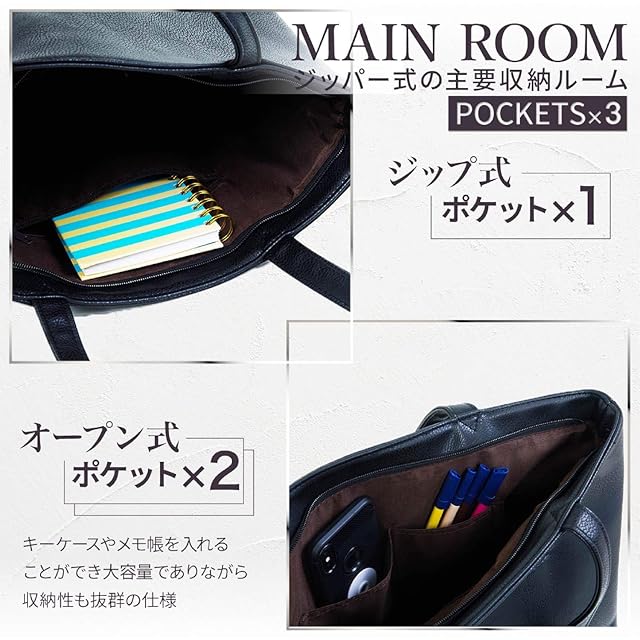 【厳選された質感とフォルム】上品で光沢を抑えたムラのあるマット革(シンセティックレザー)を仕様したトートバッグです。普段遣いのバッグとしても、ビジネスバッグとしても利用することができるON/OFF兼用のトートバッグになります。シンプルさを求め、主張しすぎないオールマイティに使える”良い意味での脇役のバッグ”となってくれます。流行に左右されない”Simple is the best”という王道を貫き、男性女性問わず愛用していただけるデザインとなっています。”なめらかで光沢を抑えたマットレザー”を採用したことで、価格以上に見栄えする高コストパフォーマンスを実現しました。収納力も素晴らしい内容で、A4サイズやB4サイズの書類だけではなく、Macbook、Windowsともにノートパソコン13インチもゆとりをもって収納することができます。さらには、パソコンを入れたままで自立する設計となっています。(極端に重量が片側に寄った場合は自立しない場合もございますのでご注意ください) 【さりげない洒落感を放つムラ革】この価格帯では実現が難しい”なめらかで光沢を抑えたムラ模様のマットレザー”で構成されたトートバッグです。落ち着いた色合いでビジネスや仕事での利用時には、バッグが主張しないため、さりげなく上品な持ち物という印象を先方に印象づけることができるビジネスバックとなります。プライベートでの利用時には、光沢を抑えてなめらかな質感にしたことでカジュアルな服装にも合わせやすく、このトートバック一つで全体をキッチリとまとめ上げお洒落感や都会的な感じを醸し出すことができます。世の中にはエナメル革やコードバン、ガラスレザー等の強い光沢を放つ皮革鞄が存在しますが、そういったカバンの光沢感とは見る人によっては価格帯が一目瞭然であったり、安っぽさが際立ってしまうことがあります。そこでRATOMトートバックは頑丈でありながら上品なシンセティックレザーを仕様し高品質なトートバッグを制作しました。 【”心惹かれる”秀逸なデザイン】プライベートバッグとしても、ビジネスバッグとしても利用できるON/OFF兼用のデザインです。バッグ選びの一番の要である”心惹かれる”バッグかどうかというシルエットデザインにこだわり洒落感のあるムラ模様のシンセティックレザーを仕様しました。男性だけでなく女性からも支持される上品な生地感と滑らかなマット感仕様でありながら、スマートな印象を与えることができる画期的なデザインとなっています。商談や打ち合わせだけではなく、デートや小旅行の際にも好感を持ってもらえるポイントが随所に散りばめられています。ショルダーバッグやキャンバストートとは違い、それだけで大人な雰囲気を演出することができ、メンズ・レディース・年齢問わずに愛用し続けられるオールマイティなバッグです。