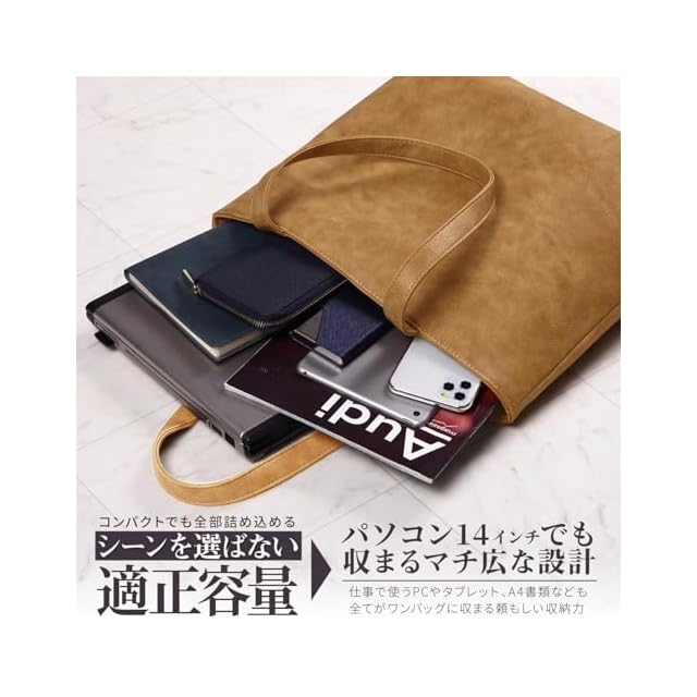 【厳選された質感とフォルム】上品で光沢を抑えたムラのあるマット革(シンセティックレザー)を仕様したトートバッグです。普段遣いのバッグとしても、ビジネスバッグとしても利用することができるON/OFF兼用のトートバッグになります。シンプルさを求め、主張しすぎないオールマイティに使える”良い意味での脇役のバッグ”となってくれます。流行に左右されない”Simple is the best”という王道を貫き、男性女性問わず愛用していただけるデザインとなっています。”なめらかで光沢を抑えたマットレザー”を採用したことで、価格以上に見栄えする高コストパフォーマンスを実現しました。収納力も素晴らしい内容で、A4サイズやB4サイズの書類だけではなく、Macbook、Windowsともにノートパソコン13インチもゆとりをもって収納することができます。さらには、パソコンを入れたままで自立する設計となっています。(極端に重量が片側に寄った場合は自立しない場合もございますのでご注意ください) 【さりげない洒落感を放つムラ革】この価格帯では実現が難しい”なめらかで光沢を抑えたムラ模様のマットレザー”で構成されたトートバッグです。落ち着いた色合いでビジネスや仕事での利用時には、バッグが主張しないため、さりげなく上品な持ち物という印象を先方に印象づけることができるビジネスバックとなります。プライベートでの利用時には、光沢を抑えてなめらかな質感にしたことでカジュアルな服装にも合わせやすく、このトートバック一つで全体をキッチリとまとめ上げお洒落感や都会的な感じを醸し出すことができます。世の中にはエナメル革やコードバン、ガラスレザー等の強い光沢を放つ皮革鞄が存在しますが、そういったカバンの光沢感とは見る人によっては価格帯が一目瞭然であったり、安っぽさが際立ってしまうことがあります。そこでRATOMトートバックは頑丈でありながら上品なシンセティックレザーを仕様し高品質なトートバッグを制作しました。 【”心惹かれる”秀逸なデザイン】プライベートバッグとしても、ビジネスバッグとしても利用できるON/OFF兼用のデザインです。バッグ選びの一番の要である”心惹かれる”バッグかどうかというシルエットデザインにこだわり洒落感のあるムラ模様のシンセティックレザーを仕様しました。男性だけでなく女性からも支持される上品な生地感と滑らかなマット感仕様でありながら、スマートな印象を与えることができる画期的なデザインとなっています。商談や打ち合わせだけではなく、デートや小旅行の際にも好感を持ってもらえるポイントが随所に散りばめられています。ショルダーバッグやキャンバストートとは違い、それだけで大人な雰囲気を演出することができ、メンズ・レディース・年齢問わずに愛用し続けられるオールマイティなバッグです。
