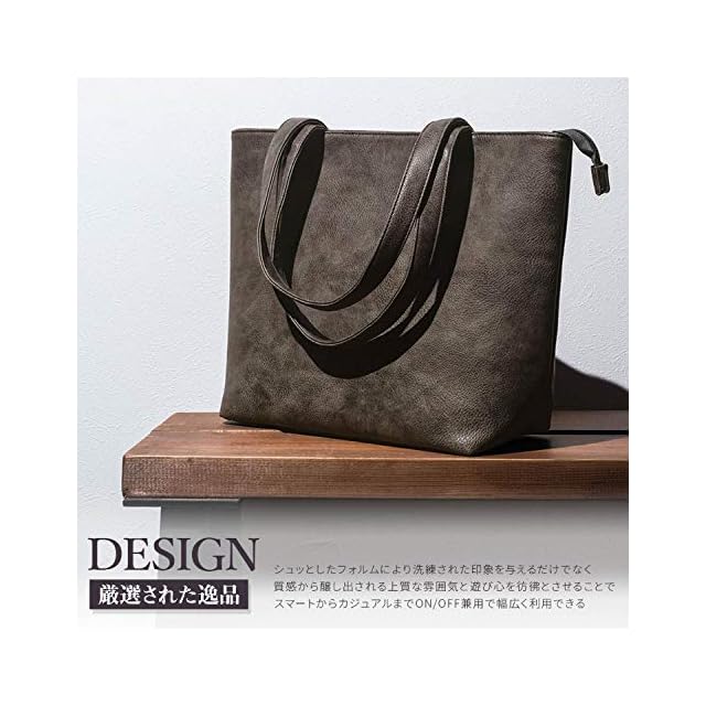 【厳選された質感とフォルム】上品で光沢を抑えたムラ模様のトートバッグです。シンプルさを求め、主張しすぎないオールマイティに使える”良い意味での脇役のバッグ”となってくれます。流行に左右されない”Simple is the best”という王道を貫き、男性女性問わず愛用していただけるデザインとなっています。”なめらかで光沢を抑えたマットなシンセティックレザー”を採用したことで、価格以上に見栄えする高コストパフォーマンスを実現しました。