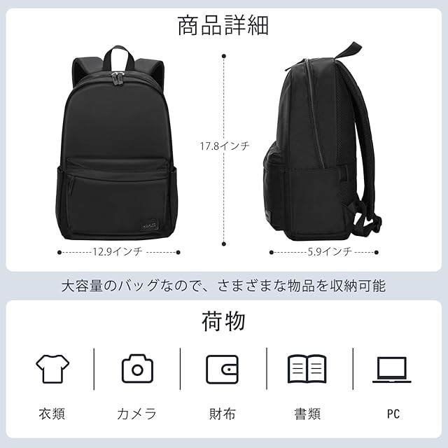 【大容量&9ポケット】バッグサイズ:45 * 33 * 18cm。大容量のカジュアルバッグなので、会社紹介書類、ウォーターカップ、折りたたみ傘、化粧ポーチ、15.6インチPC、A4ファイルなどを収納できます。たくさんのポケットを備えているので、あらゆるものを収納するのに便利です。パソコン用ポケット、ボトル用ポケットが付いています。物品の整理がとても簡単です。