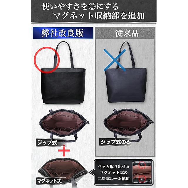 【辿り着いたオールマイティバッグ】定番トートバッグの形でありながらも利便性を重視し、トートバッグ前面には磁力式のフルサイズポケットを完備。大人びた雰囲気漂うスマートで主張しすぎないマットな風合いのシンセティックレザーで大人が持つべき秀逸なトートバッグへと仕上る。カジュアルなシーンであっても、商談などのビジネスシーンのビジネスバッグとしても利用することができるON/OFF兼用タイプ。底面には底鋲も付いており、汚れを気にせず自立バッグとして万能な活躍ができる。 【デザインを損なわない大容量タイプ】24時間365日使い続けることができる使い勝手の良い大容量タイプとなっている。A4サイズ、B4サイズの書類も折らずに収納することができる。パソコンはMacbook系、Windows系のノートパソコン16インチもしっかり収納できる。人間工学に基づき通勤でも使いやすい長めの手提げ紐にしたことで、トートバッグを身体の前後に持ってくることもできるので自分自身に合った持ち方を実現できる。 【職人品質の頑丈な耐久性バッグ】丁寧な裁縫仕上げによって丈夫で長持ちのするトートバッグ。パソコンや書類を大量に入れても安定して持ち運ぶことができる。小旅行や出張でも大容量タイプのため書類や着替えを入れても安心して移動できる。 【洗練されたシンセティックレザー】光沢を抑えて上品さを求めたシンセティックレザートートバッグ。コードバン革のような光沢の強い生地を利用せずに、あえて主張しすぎない小粋なバッグ。懐かしさと今っぽさを共存させた品のある風合いを印象づけることができる。 【機能美を追求したマグネット式ポケット】利便性とシンプルな外観を維持したスマートな前面の磁力式フルサイズポケット。ビジネス利用時には、定期券を入れることやタバコや名刺などのビジネス小物入れとして活躍する。自動車通勤でもサッと必要なモノを取り出すことができる。もちろん通常利用できるメインポケットはジップ式で防犯や外見え防止効果もある。さらにはマグネット式ポケット内には2つのオープンポケットもあるので散らばり防止もできる。