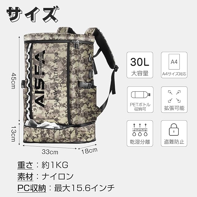 商品名:《新品未開封》[AISFA] リュック メンズ リュックサック スクエア バックパック 防水17インチ PC ビジネス ラップトップバック USB充電ポート付き 30L アウトドア旅行防災 通勤 靴/弁当収納 (くさいろ迷彩)