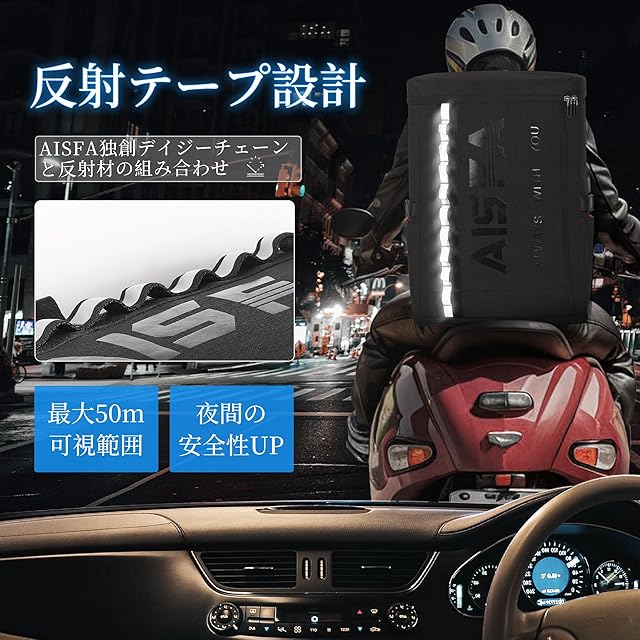 【再帰反射|デイジーチェーン】アップグレード!賢い機能性と飽きの来ないデザインを組み合わせて制作されたAISFAバックパック。フロントポケットの外側には、カラビナのように他の付属品を取り付けることができるデイジーチェーンが1本追加されています。AISFAオリジナルのデイジーチェーンと反射材を組み合わせ、より安全な夜間移動を実現します。反射材の夜間可視は最大50mまでであり、車のライトに強く反射し安全を保ちます。