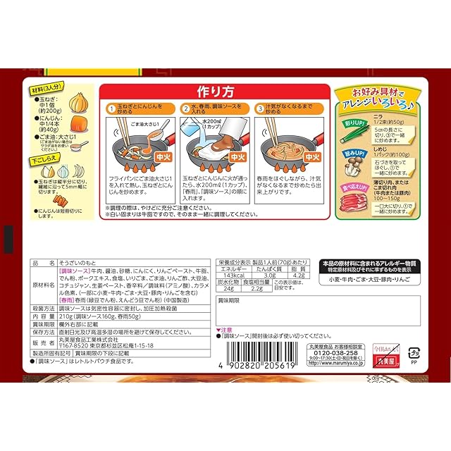 原材料:[調味ソース]牛肉、醤油、砂糖、にんにく、りんごペースト、牛脂、でん粉、ポークエキス、食塩、いりごま、ごま油、りんご酢、大豆油、コチュジャン、生姜ペースト、香辛料/調味料(アミノ酸)、カラメル色素、(一部に小麦・牛肉・ごま・大豆・豚肉・りんごを含む)| [春雨]春雨(緑豆でん粉、えんどう豆でん粉)(中国製造)