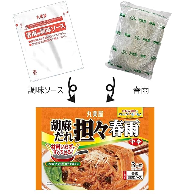 原材料:[調味ソース]鶏肉、きくらげ、練りごま、粒状植物性たん白、砂糖、すりごま、醤油、ごま油、みそ、エキス(ポーク、チキン)、大豆油、食塩、醸造酢、にんにくペースト、酵母エキスパウダー、豆板醤、山椒/増粘剤(加工でん粉、増粘多糖類)、調味料(アミノ酸等)、着色料(カラメル、カロチノイド)、香辛料抽出物、(一部に小麦・ごま・大豆・鶏肉・豚肉を含む)| [春雨]春雨(緑豆でん粉、えんどう豆でん粉)(中国製造)