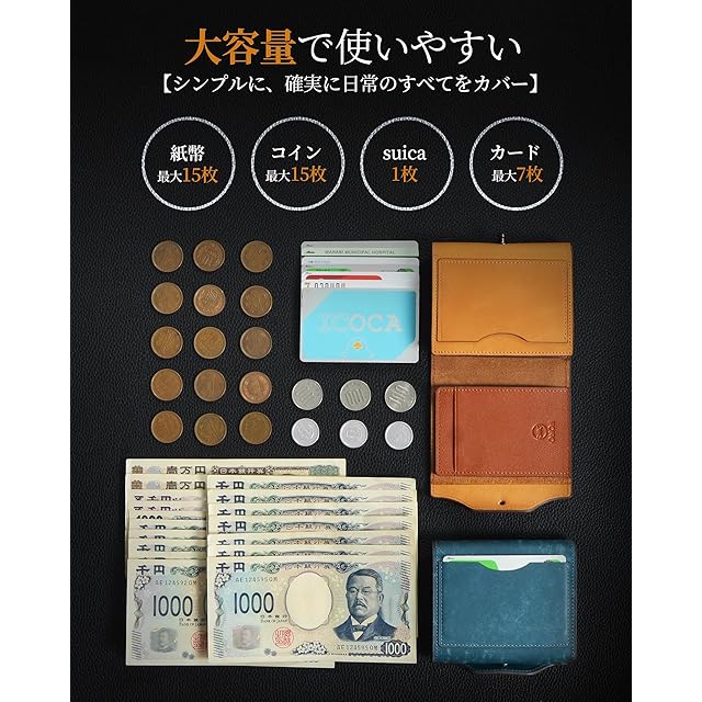 【大容量 財布 メンズ】硬貨15枚・紙幣15枚・カード7枚・Suica1枚を一括収納可能な3つ折り箱状財布。紙幣固定ポケットでズレと角折れを防止。左利きにも右利きにも対応した設計で快適操作を実現。