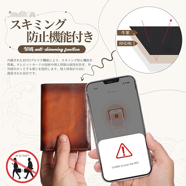 【上質な牛革生地】 ズボンの後ろポケットやジャケットの内ポケットに入れることが多い二つ折り財布だからこそ、丈夫で型くずれしにくい上質な本革を使用しております。 優しく手に馴染む柔らかな質感の牛革です。手作業で作られた革は、色むらやシミなどによって一つひとつが独特の表情を持ち、長く使うほどその魅力が増していきます。思わず目を惹く美しい発色と上品な艶があります。上品で目立ち過ぎないシボ感が特徴。使えば使うほど味が出る本革を使用しています。シンプルで飽きが来ない、使いやすくて安全。手に取っていただいた方に長く愛される、そんな財布を目指しました。
