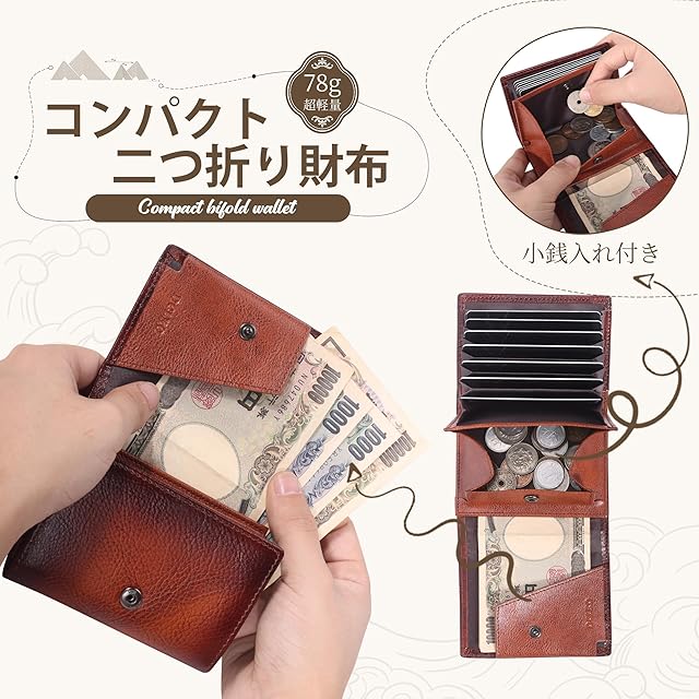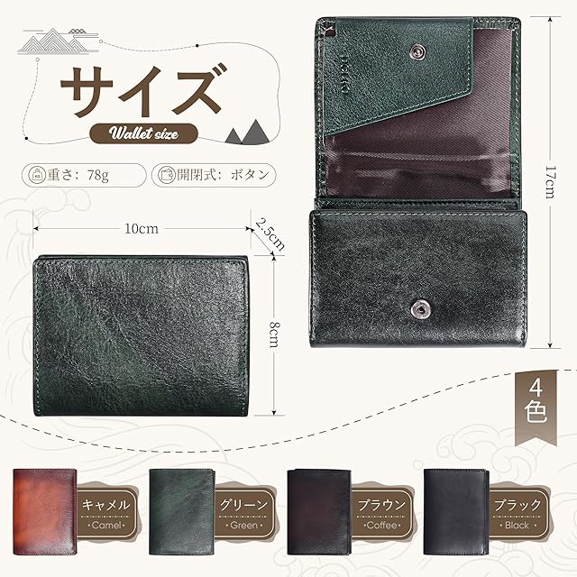 【商品説明 】 素材:本革 サイズ : 10.5㎝ × 8㎝ × 2.5㎝、重量:約78g。収納:札入れ×1、BOX型小銭入れ×1、カード入れ×9。