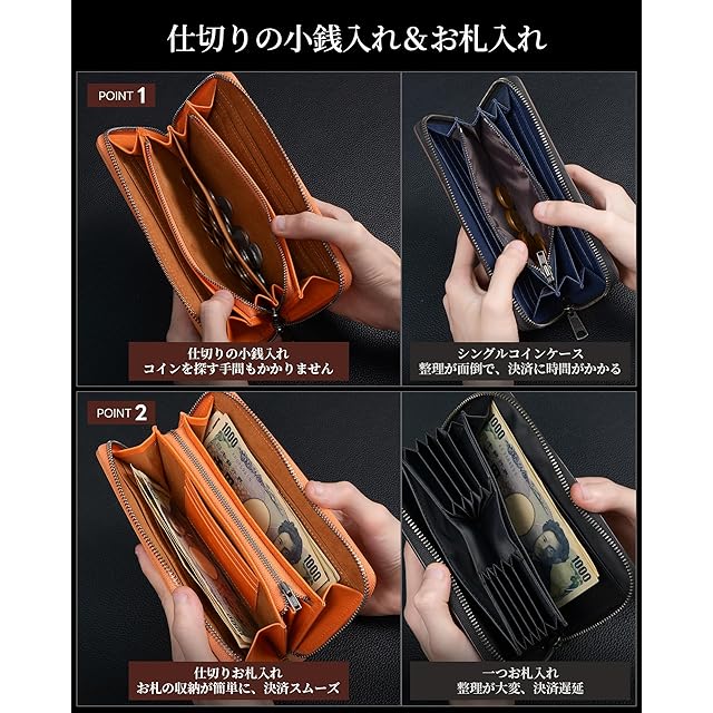 【2室のお札入れと小銭入れ】財布 メンズの内側に仕切りがあり、千円札と一万円・五千円札、異なる金額の硬貨を仕分けることが可能です。さらに2枚の仕切りにレシートを挟むことも可能です。スッキリ整理整頓されることで、お支払い時も秒で取り出せます。対称デザインを採用しているため、左利きの方でも右利きの方でも、どちらの手でも快適に長財布お使いいただけます。