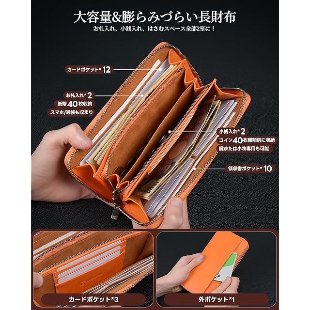 【圧倒的な大容量 財布】お札入れ2箇所、小銭入れ2箇所、カードポケット15箇所、フリーポケット3箇所で、カード15枚、紙幣40枚、コイン40枚、領収書10枚すべてを入れても、財布本体のフォルムを崩すことなく、美しい収納を実現します。メンズ財布の深さが十分にあるため、長財布の中にも通帳またはスマホが入ります。
