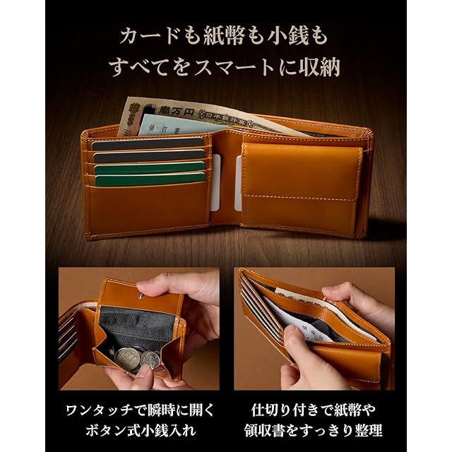 【カードも紙幣も小銭も、すべてをスマートに収納】 6つのカードポケットは、しっとりとなめらかな本革製。カードの出し入れが驚くほどスムーズで、支払いの所作もスマートに演出します。小銭入れはワンタッチでパッと開くボタン式を採用し、会計時のストレスをゼロに。札入れは仕切り付きなので、紙幣と領収書をきれいに分けて収納できます。コンパクトながら必要なものをすべて収められる、頼れる二つ折り財布。ポケットやバッグにすっきり収まり、日常使いにもビジネスにもフィットする一品です。