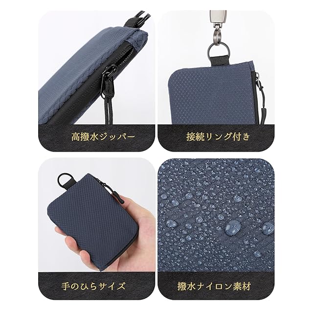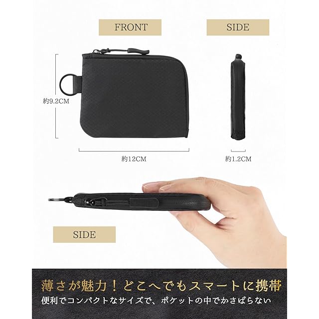 【商品スペック/サイズ】■サイズ:(約)縦9.2×横12×高さ1.2cm(横はリング部分を除く)■重量:(約)20g ■財布ポケット数:コインポケットx1、フリーポケットx4 ■主要素材:撥水ナイロン ※写真の内容物は付属しません。