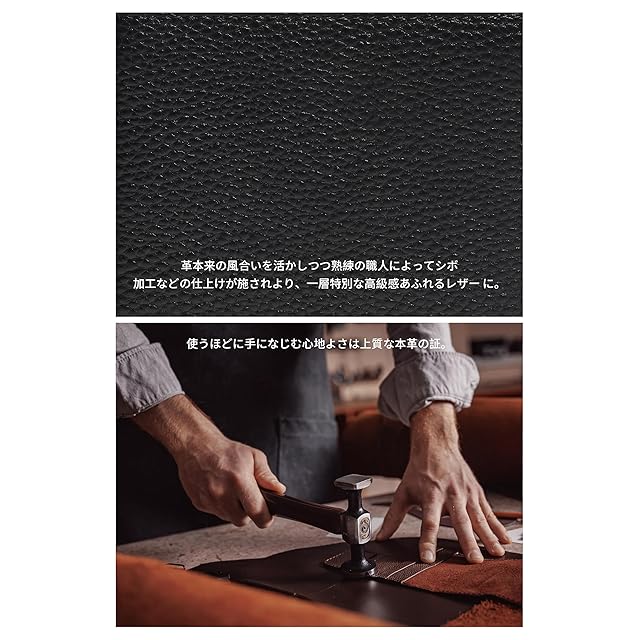 【上質な牛本革素材財布】革本来の自然な風合いと、高級感ある質感を併せ持つ上品な牛本革を使用。手にしっとり馴染む柔らかさと、長く使うほどに味わいを増す経年変化が楽しめます。大人の品格を引き立てる一品です。