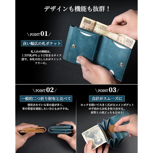 【コンパクトなのに圧倒的な収納力!】 使い勝手の良い幅広の札ポケットで、1万円札がぴったり収まるサイズ感 二つ折り財布。お札の出し入れもストレスフリーでスムーズです。財布 大容量 メンズ 最大で20枚の紙幣、30枚のコイン、6枚のカードを収納可能です。