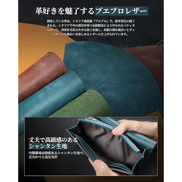 【直輸入イタリア最高級プエブロレザー】長財布はイタリアから輸入したプエブロレザーを使用しています。プエブロレザーは、イタリアの高品質な革で、仕上げ加工で意図的に表面を荒く毛羽立たせた、自然な風合いと繊細な手触りを実現しました。艶がすぐに出るため、変化の仕方がとても劇的であるほか、使い込むことで見せるしっとりとした吸い付くような質感も、魅力的なポイントです。