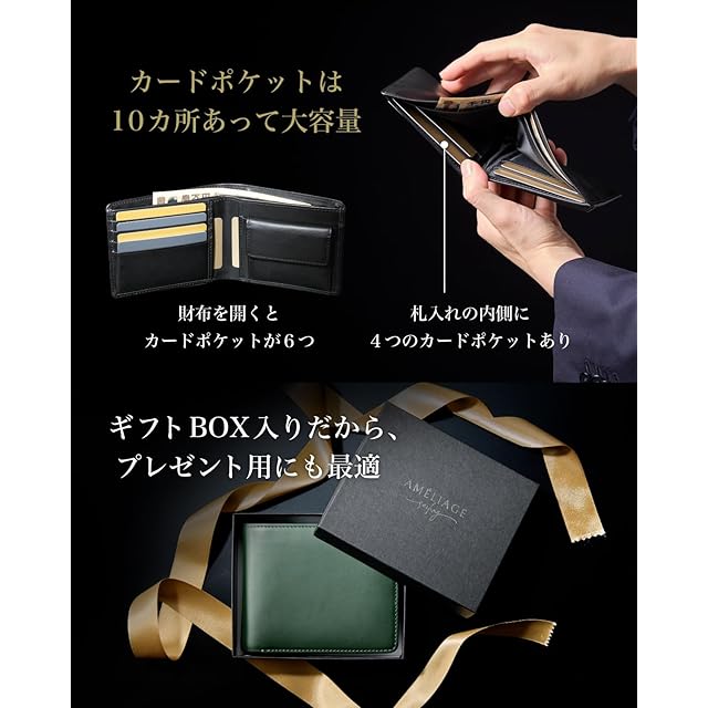 ✅【日本製/姫路レザー二つ折り財布】オーソドックスでスタイリッシュなデザインのメンズ本革財布です。機能美を追求した納得のメイドインジャパン。コンパクトすぎず大きすぎずの絶妙なサイズ感で手に収まりやすいです。カード、お札、小銭がしっかり入る収納力の高さも魅力です。 ✅【レザーソムリエ監修の牛革】スムースなナッパレザーを使用しているので高級感があり、使い込むほどにツヤや光沢感が増し、手に吸い付くような感覚になります。経年変化を楽しみながら長く愛用できる点が魅力です。 ✅【使いやすく設計したコインポケット】コインポケットの高さを7cmと少し浅くすることでコインを取りやすく設計。また、開け口を6cmと広くして、更に取り出しやすいようにしました。浅めのポケットでガバッと大きく開くからコインが取り出しやすいです。札入れには仕切りがあって、お札や領収書などを整理して入れられます。カード入れは10カ所あって大容量!財布を開くとカードポケットが6つ、札入れの内側に4つのカードポケットがあります。 ✅【熟練職人が多数在籍!有名ブランドも手がける工場で製作】技術開発・伝承に力を入れ、安定した品質の製品を提供する革工場で生産しました。《年間工場出荷数120万個突破》《ISO9001・2008取得工場》【専用のギフトBOX付き】商品はamēliage専用の化粧箱に入れてお届けいたします。大切な方へのプレゼント用にも最適です。 ✅【商品詳細】◆仕様:カードポケット×10、小銭入れ×1、札入れ×2 ◆サイズ:幅約11.5cm×高さ約9.6cm×厚み約2.5cm ◆カラーバリエーション:ブラック・ネイビー・モスグリーン・ブラウン ◆用途:財布、カード入れ、カードケース、小銭入れ、お札入れ、領収証入れ ◆メーカー付き:万が一商品に不良があれば、商品到着後、期間内につき、返品・返金いたします。