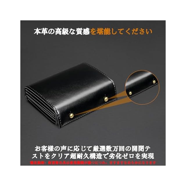 【厳選素材】 職人が自ら厳選した高級本革を使用。質感・耐久性・軽量性・防水性を完璧に融合させました。各ウォレットは職人が心を込めて製作し、日本の伝統的な職人精神を体現しています。使用するたびに、その高級感と熟練の技が感じられるでしょう。 【整然とした収納力】 軽量ながらも、ロングウォレット並みの大容量を実現。3つの大容量カードスロット・2つの使い勝手の良いサイドカードスペース・1つの硬貨収納部・1つの紙幣収納部を備え、計20枚のカード・40枚の硬貨・20枚の紙幣を収納可能です。 【合理的なデザイン】 大容量収納を実現しつつ、コンパクトなボックス型ウォレット。全長10.8cm×高さ8.6cm×厚さ3cmのサイズは、手のひらにぴったり収まり、負担を感じさせません。都会のスピード感あふれる生活に最適なサイズです 様々な業界のお客様から「長期使用で留め具が破損する」というフィードバックをいただき、継続的なテストを重ねました。その結果、「万回以上の閉じ動作でも破損しない」耐久性に優れた留め具を開発。今回のアップグレードは大成功に終わりました 【高級感あふれるギフトボックス】 当ウォレットには、細部にこだわりを凝らした高級感あふれる包装ボックスを同梱。夫・父・母・友人への記念日に最適です。また、品質として「購入日から1年以内に商品に不具合が発生した場合、またはご満足いただけない場合は、無条件で返金または交換いたします」。安心してお選びください。ご満足は弊社の最優先の約束です