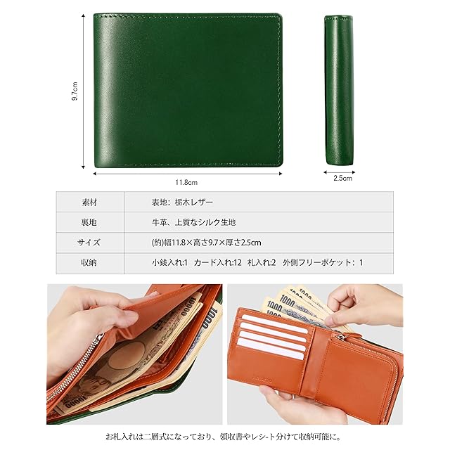 【商品仕様】:(素材 ):栃木 レザー;(カラー5色):ブラックx2、グリーン、ブラウン、コーヒー;(サイズ):たて11.8cm×よこ9.7cm×厚2.5cm;重さ:約100g(仕様):カード入れx12、札入れx2、外ポケットx1(ICカード対応)、L字型ファスナー小銭入れ× 1(コイン出し入れ簡単)。開いたときにパッと見渡せる。さらに、カードもお札も取り出しやすい構造になっています。