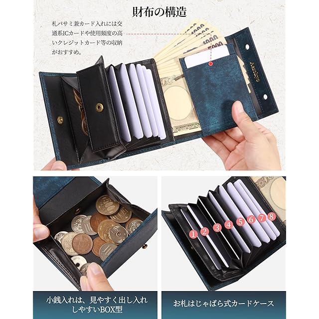 【収納力だけじゃない充実の機能面】▶BOX型の小銭入れは:開いたときにパッと見渡せる、ひと目で小銭を判別しやすいのでコンビニのレジでもアタフタしない!会計がスマート。▶じゃばら式カードケース:財布を開いたらぱっと目につく特徴的なじゃばらカードポケット。見渡しやすく、出し入れしやすい8のカードポケットはクレジットカードやキャッシュカード、ポイントカードや免許証、診察券などいろいろなカードを整頓。▶フリーカードポケット:ICカードは独立したカードポケットに入れることで、他のカードと干渉しづらく、改札などもそのまま通過できます。