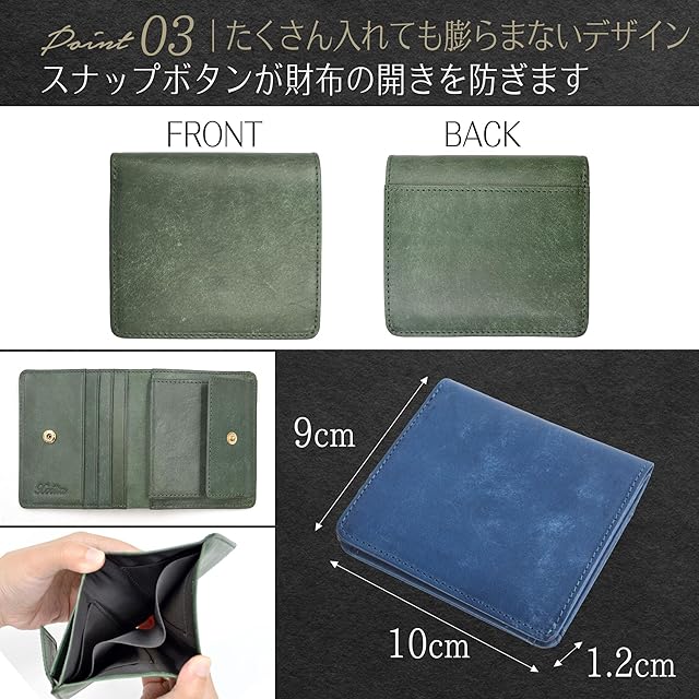 【薄く 小さく たくさん入る 2つ折り財布】 薄型コンパクト財布でありながら、札20枚・小銭20枚・カード10枚収納可能な充実の収納力。沢山収納してもスナップボタンが財布の開きを防ぎます。小さなボディに驚きの収納力を兼ね備えた コンパクト財布 です。